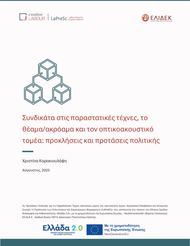 results/dissemination policy recommendations Union Representation in the Performing Arts and Audiovisual Sectors: Key Challenges and Policy Directions Full policy brief (in Greek), here. Policy Brief for the Performing Arts: Supporting Creativity andArtistic Production Full policy brief (in Greek), here.
